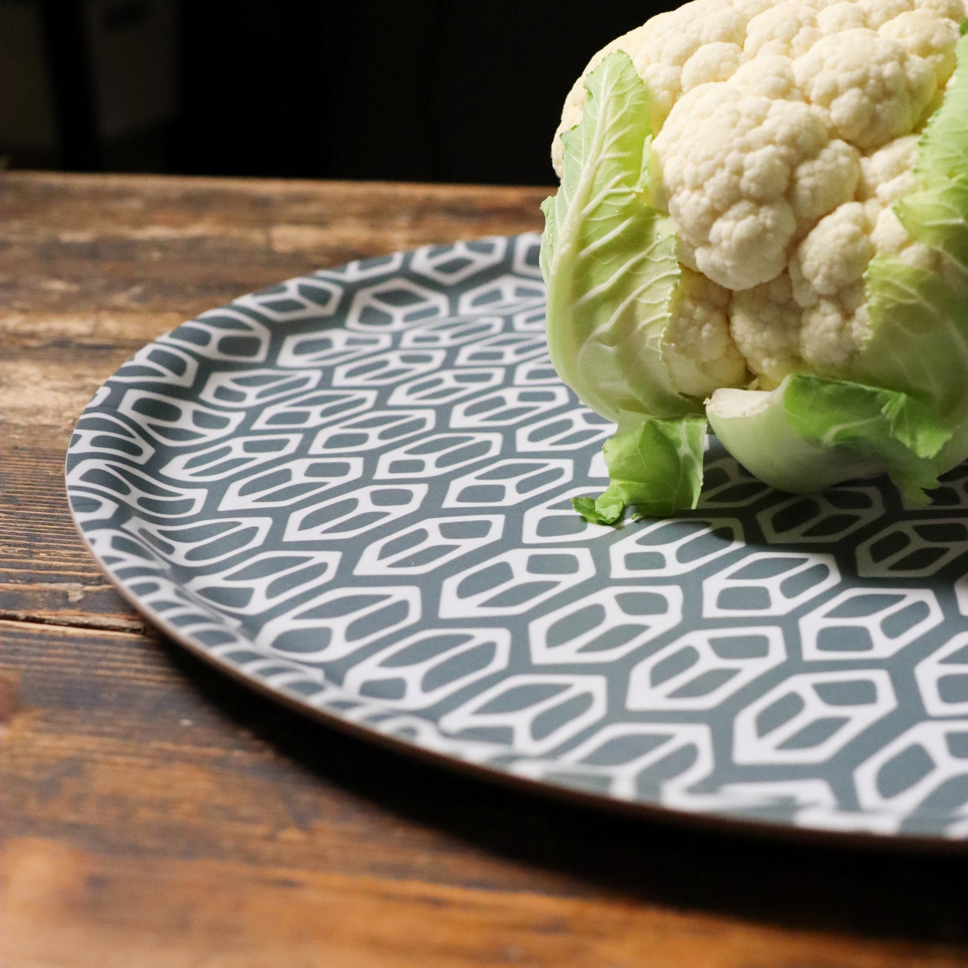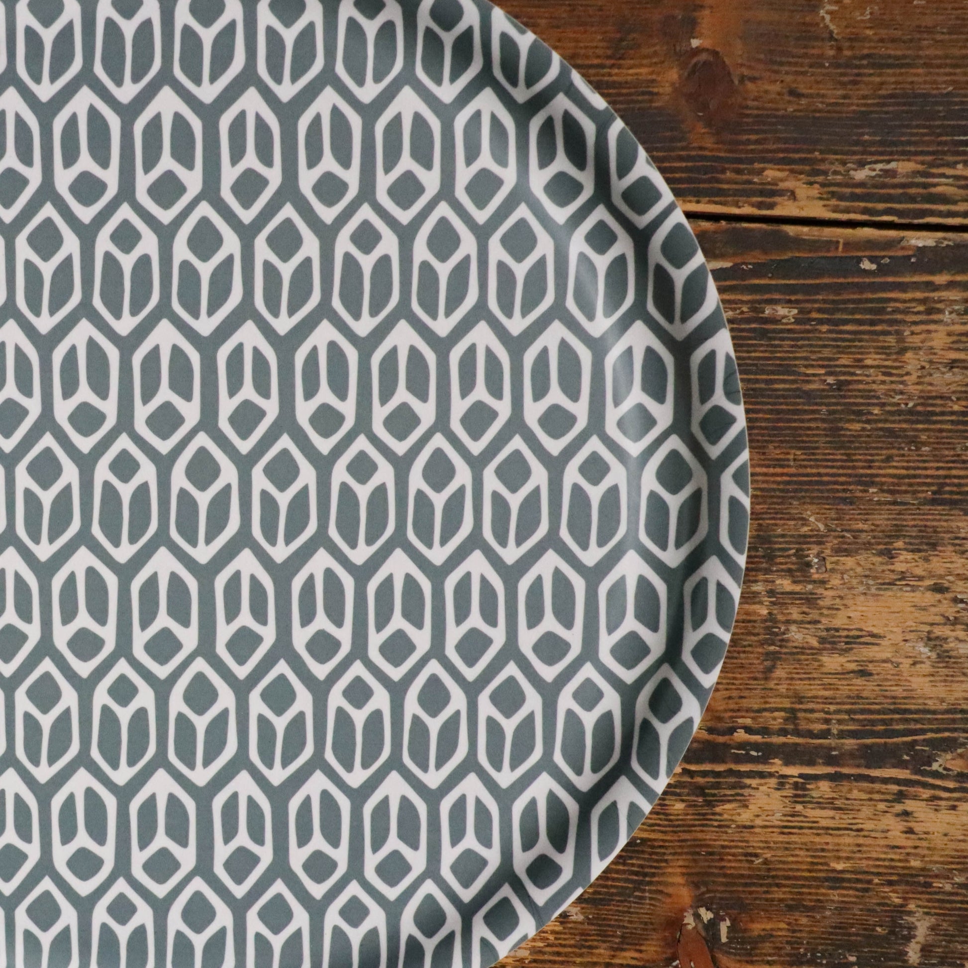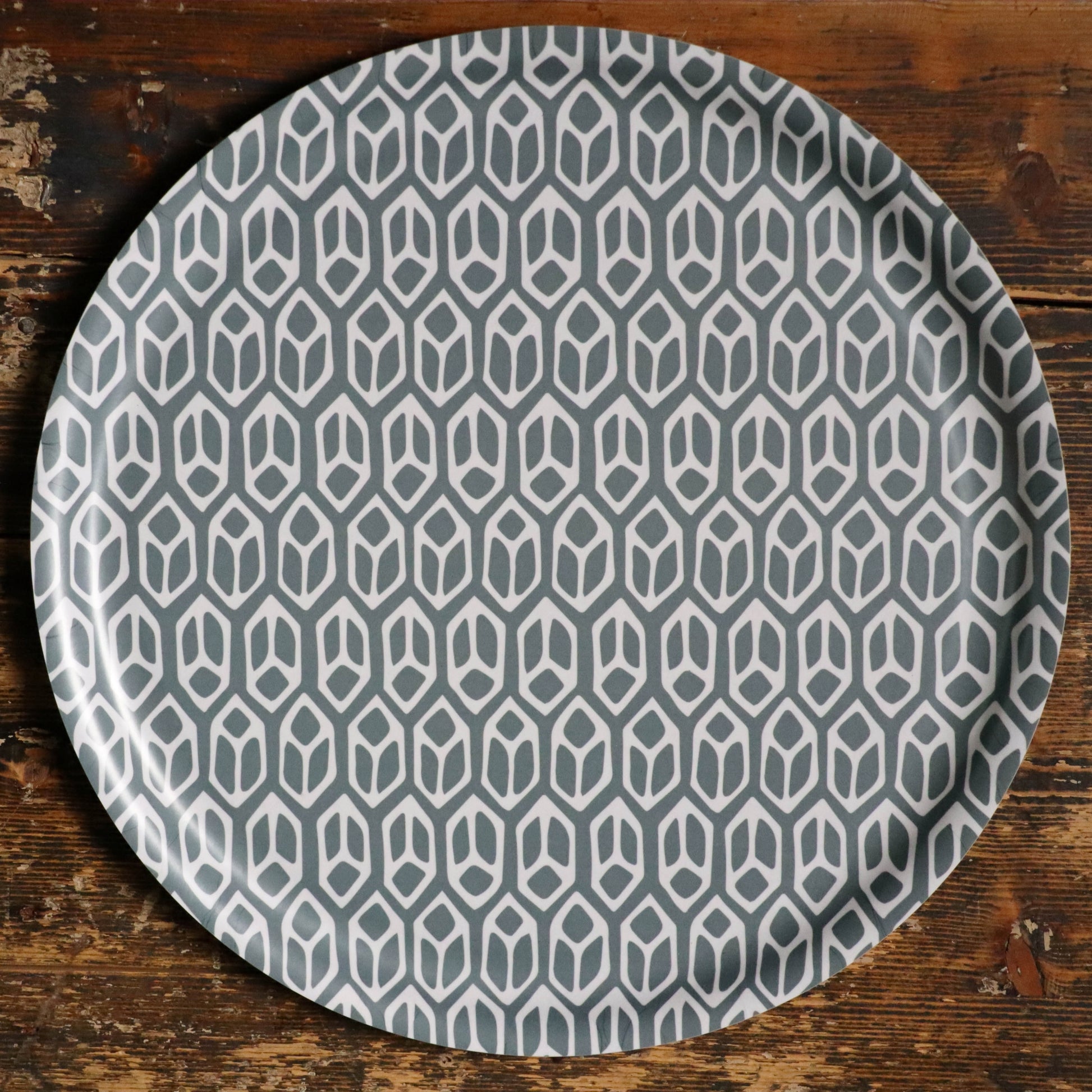 Mönstrad bricka i björkfaner med tålig melaminyta. Vit baksida. Handdisk rekommenderas. Tillverkad för hand i Finland. Finns i två olika storlekar.