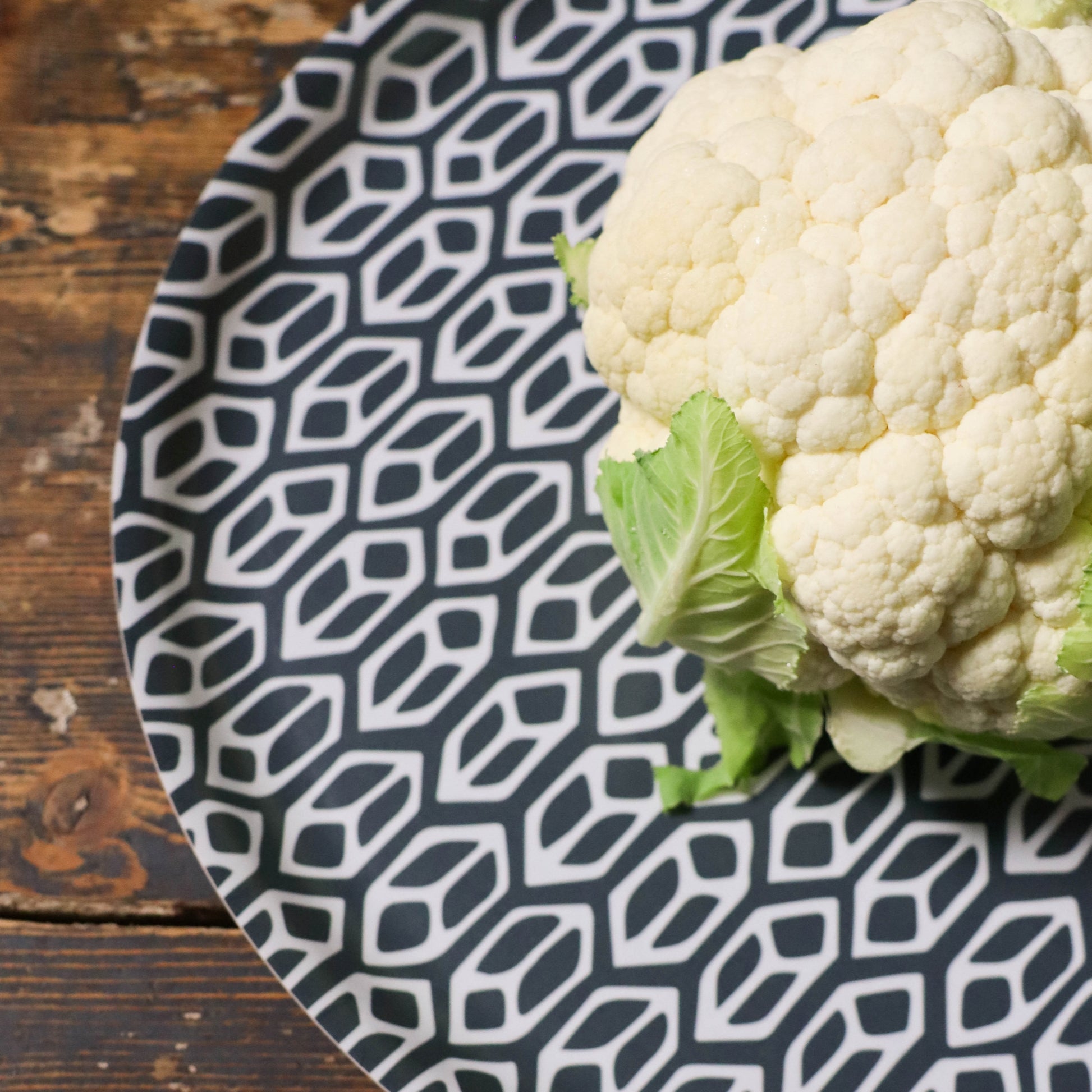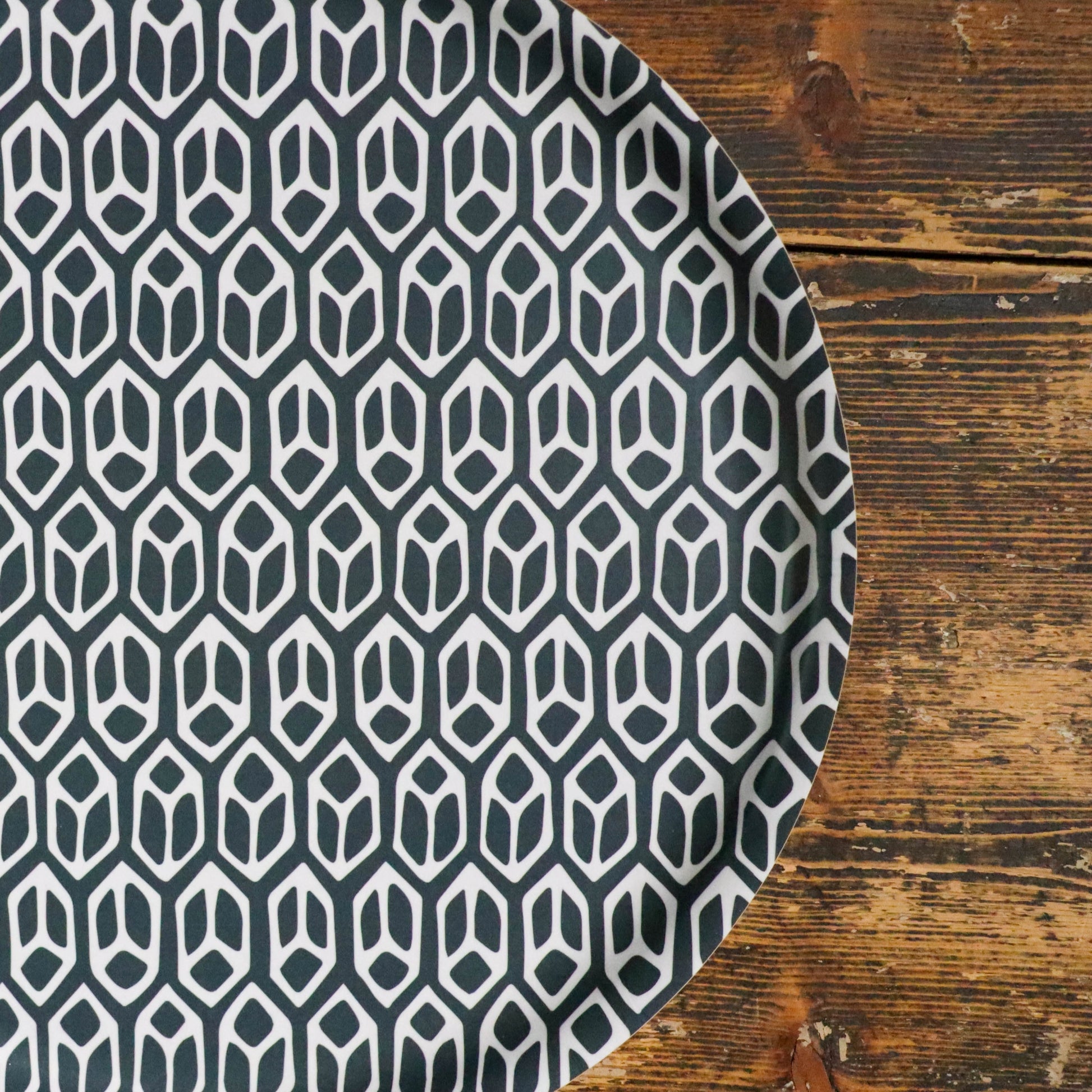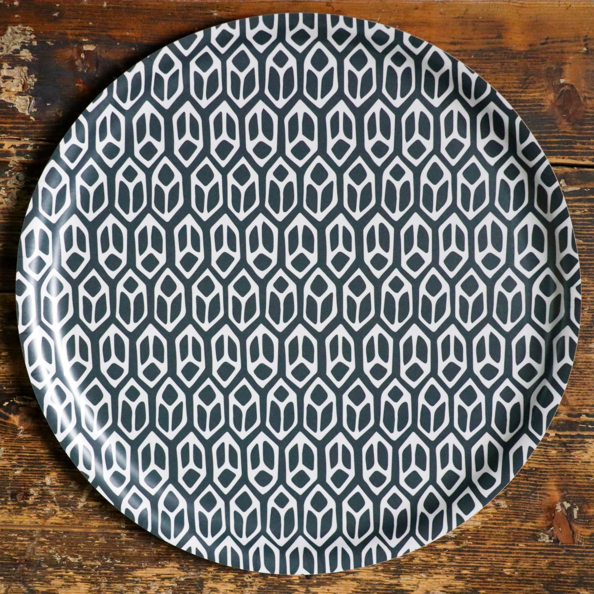 Mönstrad bricka i björkfaner med tålig melaminyta. Vit baksida. Handdisk rekommenderas. Tillverkad för hand i Finland. Finns i två olika storlekar.