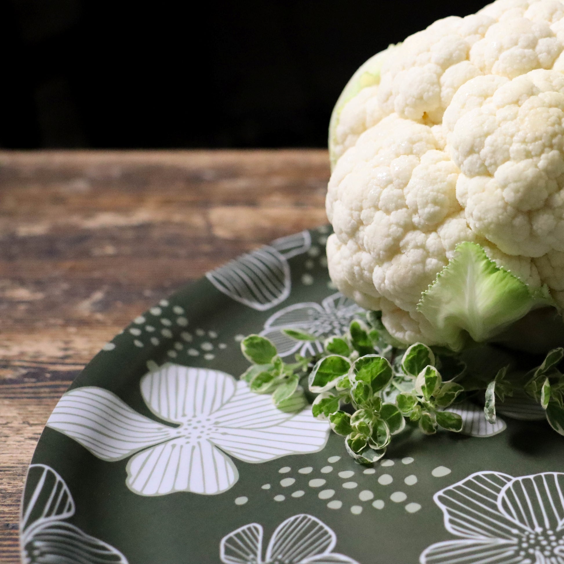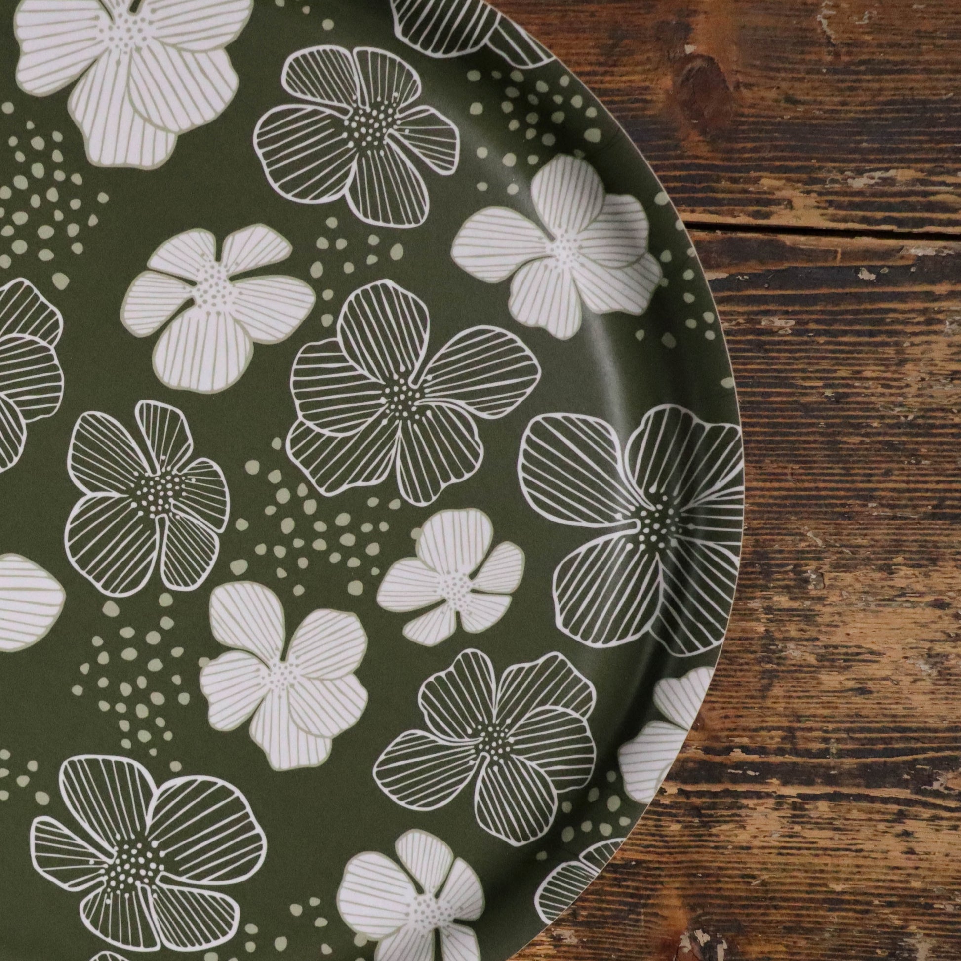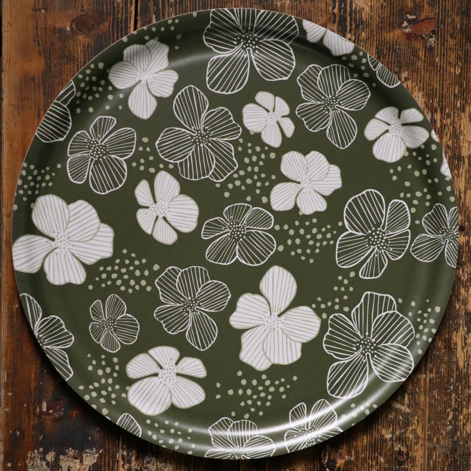Mönstrad bricka i björkfaner med tålig melaminyta, diam. 35 cm. Vit baksida. Handdisk rekommenderas. Tillverkad för hand i Finland.